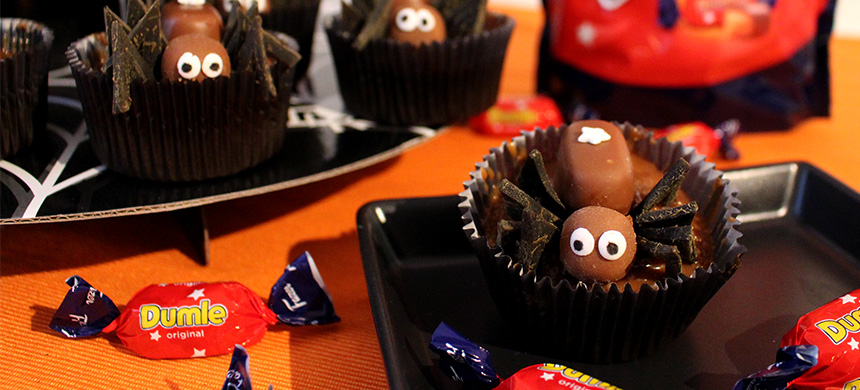 Ta 4 Dumle-kolor och dela dem itu. Rulla halvorna en åt gången mellan handflatorna tills du har åtta jämna kulor. Lägg en hel kola och en kula på varje cupcake som spindelkropp och -huvud. Rulla 16 små kulor av sockermassan och tryck ut dem till platta rundlar som bildar spindelns ögon. Måla svarta prickar med livsmedelsfärg som pupiller på rundlarna. Fäst ögonen på kolakulorna med ätbart lim. Fäst en vit stjärna med ätbart lim på den hela kolan på varje cupcake. Skär Fazer-lakritsstängerna i fyra bitar. Skär lakritsbitarna i fem skivor i längdriktning och ta bort den rundaste av dem. Skär ut avlånga trianglar av lakritsskivorna till ben och skär även ut en triangel inuti. Lämna dock 3 mm i nedre kanten på en sida (den som fästs vid huvudet) så att du kan fästa benen. Placera ut benen, 4 per sida, runt huvudet. Använd vid behov ätbart lim.